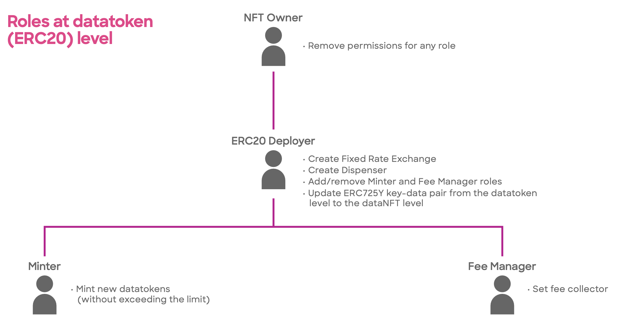 <table><thead><tr><th width="210">Action ↓ / Role →</th><th width="159">ERC20 Deployer</th><th width="93">Minter</th><th width="117">NFT owner</th><th>Fee manager</th></tr></thead><tbody><tr><td>Create Fixed Rate exchange</td><td><strong>✓</strong></td><td></td><td></td><td></td></tr><tr><td>Create Dispenser</td><td><strong>✓</strong></td><td></td><td></td><td></td></tr><tr><td>Add minter</td><td><strong>✓</strong></td><td></td><td></td><td></td></tr><tr><td>Remove minter</td><td><strong>✓</strong></td><td></td><td></td><td></td></tr><tr><td>Add fee manager</td><td><strong>✓</strong></td><td></td><td></td><td></td></tr><tr><td>Remove fee manager</td><td><strong>✓</strong></td><td></td><td></td><td></td></tr><tr><td>Set data</td><td><strong>✓</strong></td><td></td><td></td><td></td></tr><tr><td>Clean permissions</td><td></td><td></td><td><strong>✓</strong></td><td></td></tr><tr><td>Mint</td><td></td><td><strong>✓</strong></td><td></td><td></td></tr><tr><td>Set fee collector</td><td></td><td></td><td></td><td><strong>✓</strong></td></tr></tbody></table>