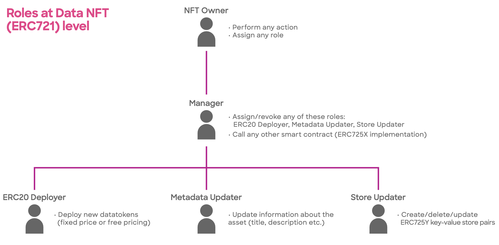 <table><thead><tr><th width="216">Action ↓ / Role →</th><th width="122">NFT Owner</th><th width="102">Manager</th><th width="160">ERC20 Deployer</th><th width="160">Store Updater</th><th width="170">Metadata Updater</th></tr></thead><tbody><tr><td>Set token URI</td><td></td><td></td><td></td><td></td><td></td></tr><tr><td>Add manager</td><td><strong>✓</strong></td><td></td><td></td><td></td><td></td></tr><tr><td>Remove manager</td><td><strong>✓</strong></td><td></td><td></td><td></td><td></td></tr><tr><td>Clean permissions</td><td><strong>✓</strong></td><td></td><td></td><td></td><td></td></tr><tr><td>Set base URI</td><td><strong>✓</strong></td><td></td><td></td><td></td><td></td></tr><tr><td>Set Metadata state</td><td></td><td></td><td></td><td></td><td><strong>✓</strong></td></tr><tr><td>Set Metadata</td><td></td><td></td><td></td><td></td><td><strong>✓</strong></td></tr><tr><td>Create new datatoken</td><td></td><td></td><td><strong>✓</strong></td><td></td><td></td></tr><tr><td>Executes any other smart contract</td><td></td><td><strong>✓</strong></td><td></td><td></td><td></td></tr><tr><td>Set new key-value in store</td><td></td><td></td><td></td><td><strong>✓</strong></td><td></td></tr></tbody></table>