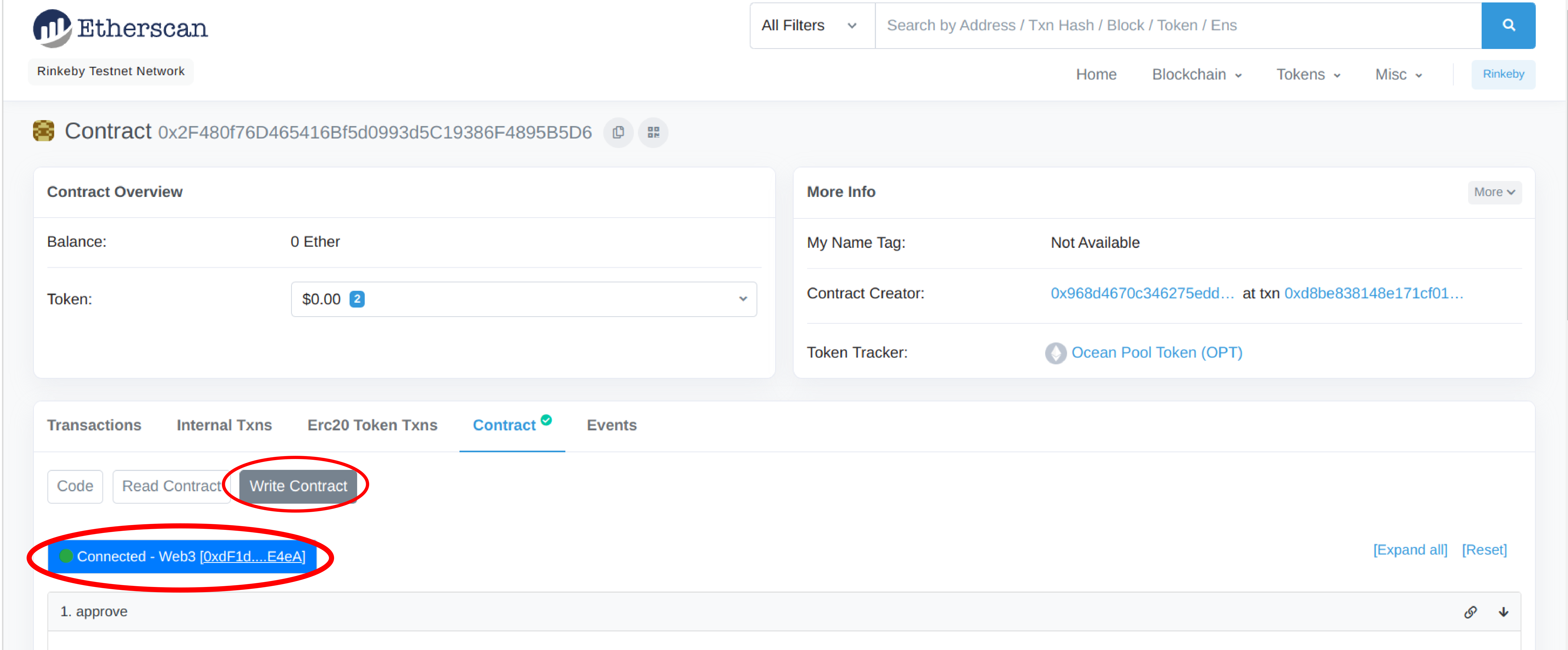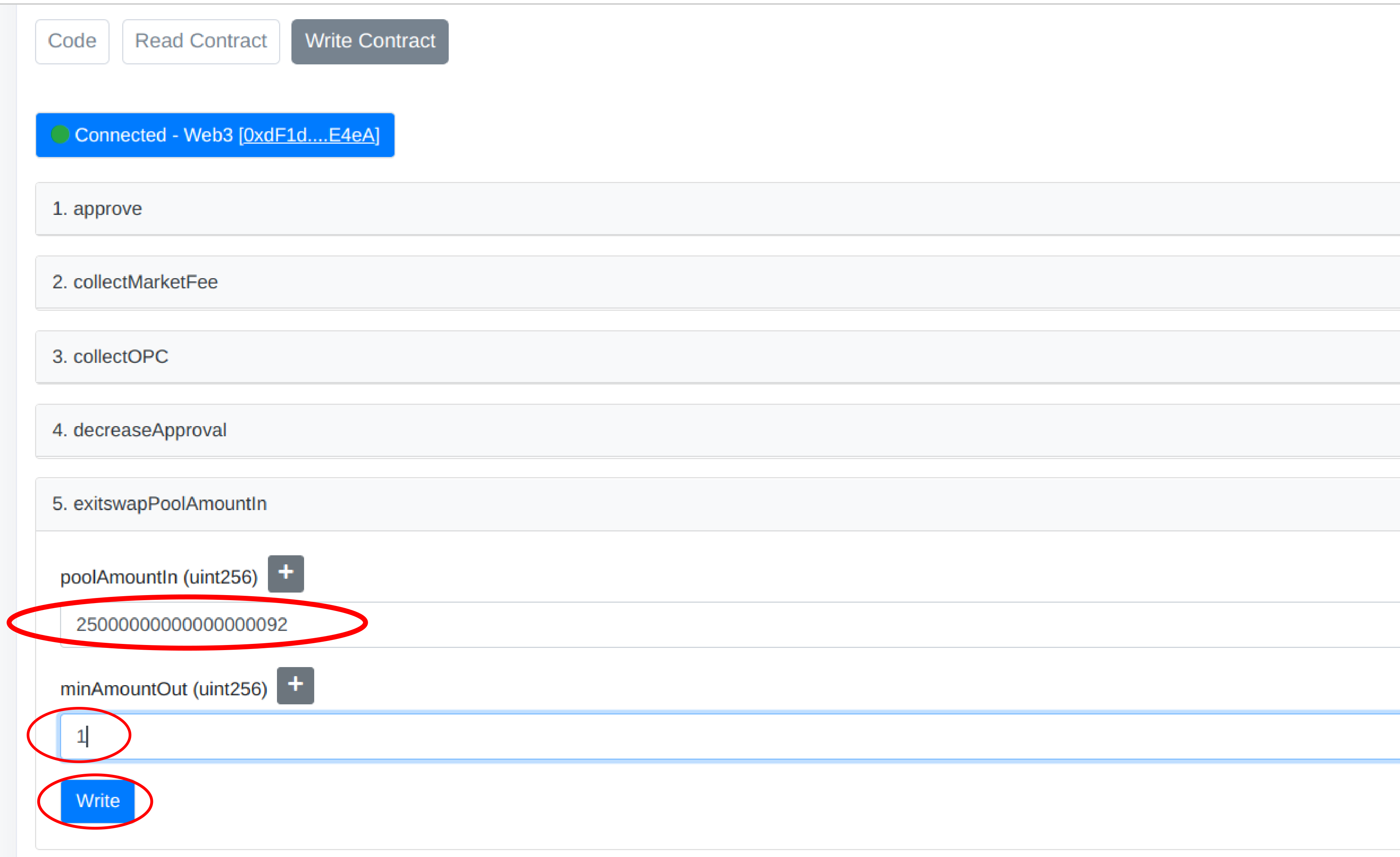 8\. Go to *Contract* -> *Write Contract* and connect your wallet. Be sure to have your wallet connected to network of the pool.
