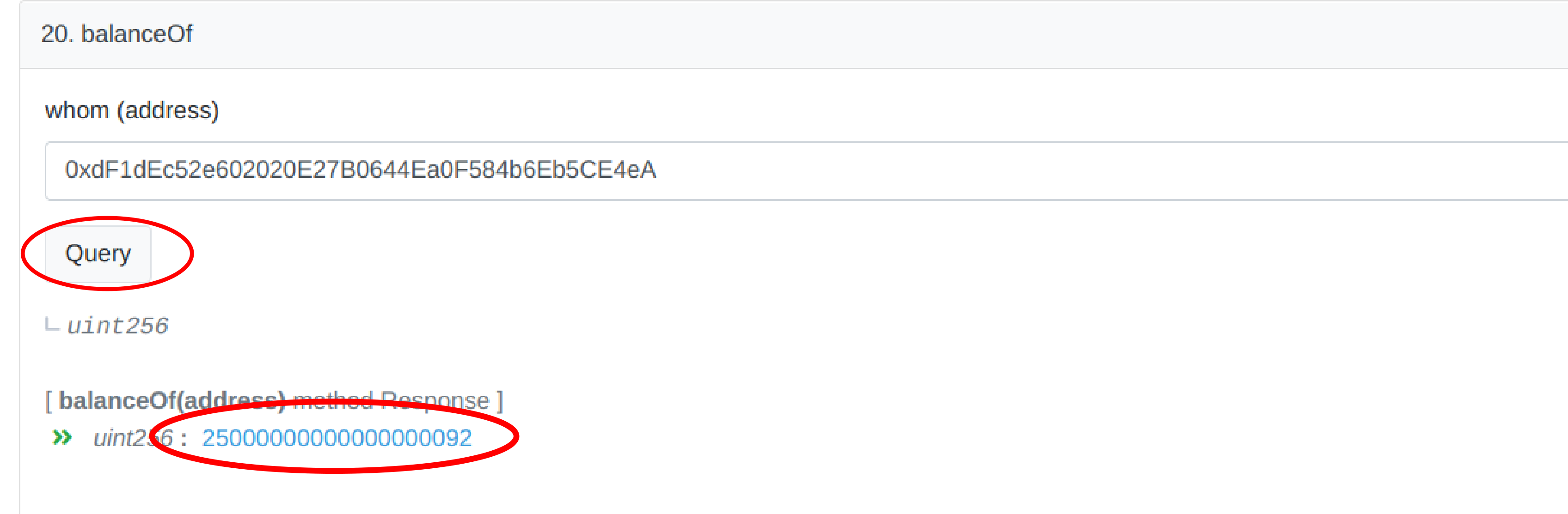 4\. Go to field `20. balanceOf` and insert your ETH address. This will retrieve your pool share token balance in wei.