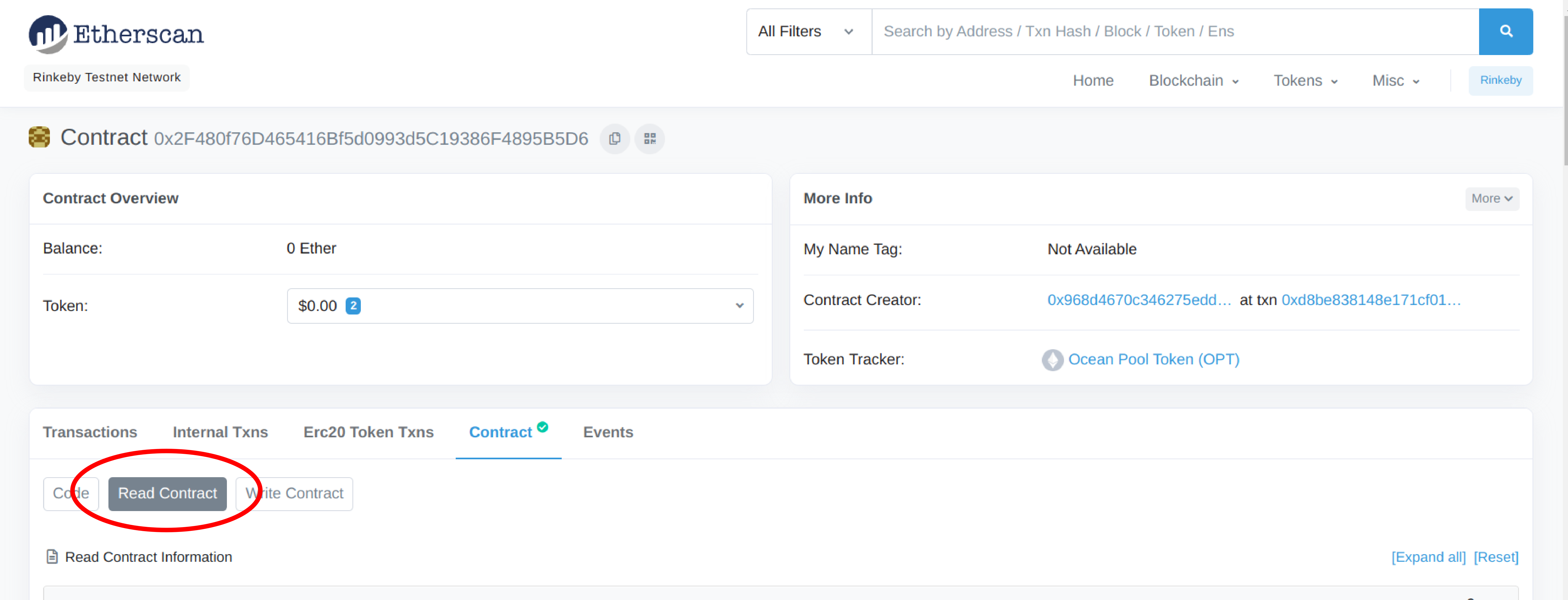 3. On the pool contract page, go to *Contract* -> *Read Contract*.